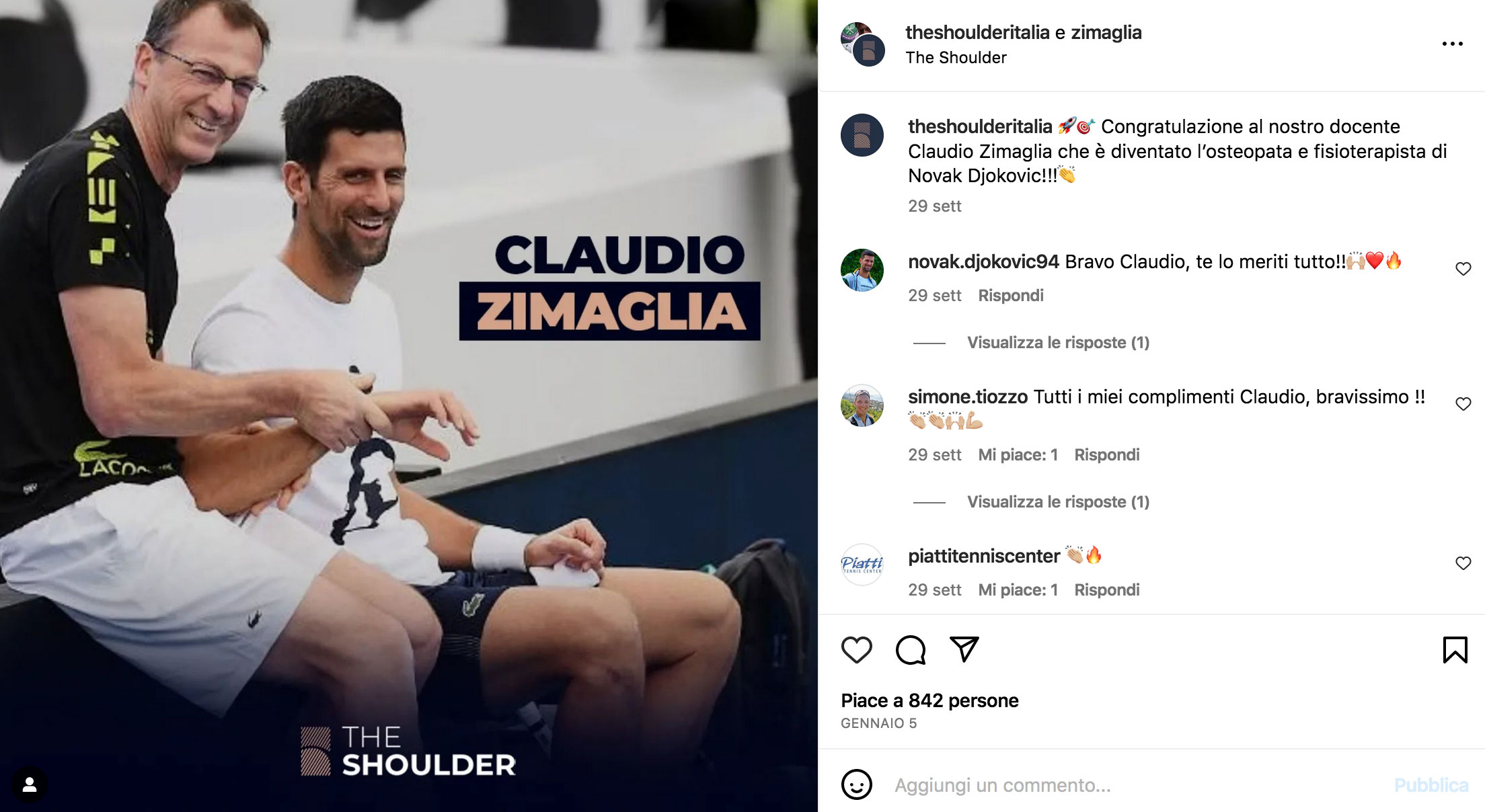 Djokovic, invece, cercava una figura in grado di dare continuità all’ottimo lavoro svolto negli ultimi anni col fisioterapista argentino Ulises Badio, e ha deciso così di continuare a seguire la linea italiana (che nel suo team annovera già i due agenti Edoardo Artaldi ed Elena Cappellaro, e il preparatore atletico Marco Panichi) puntando su Claudio Zimaglia.